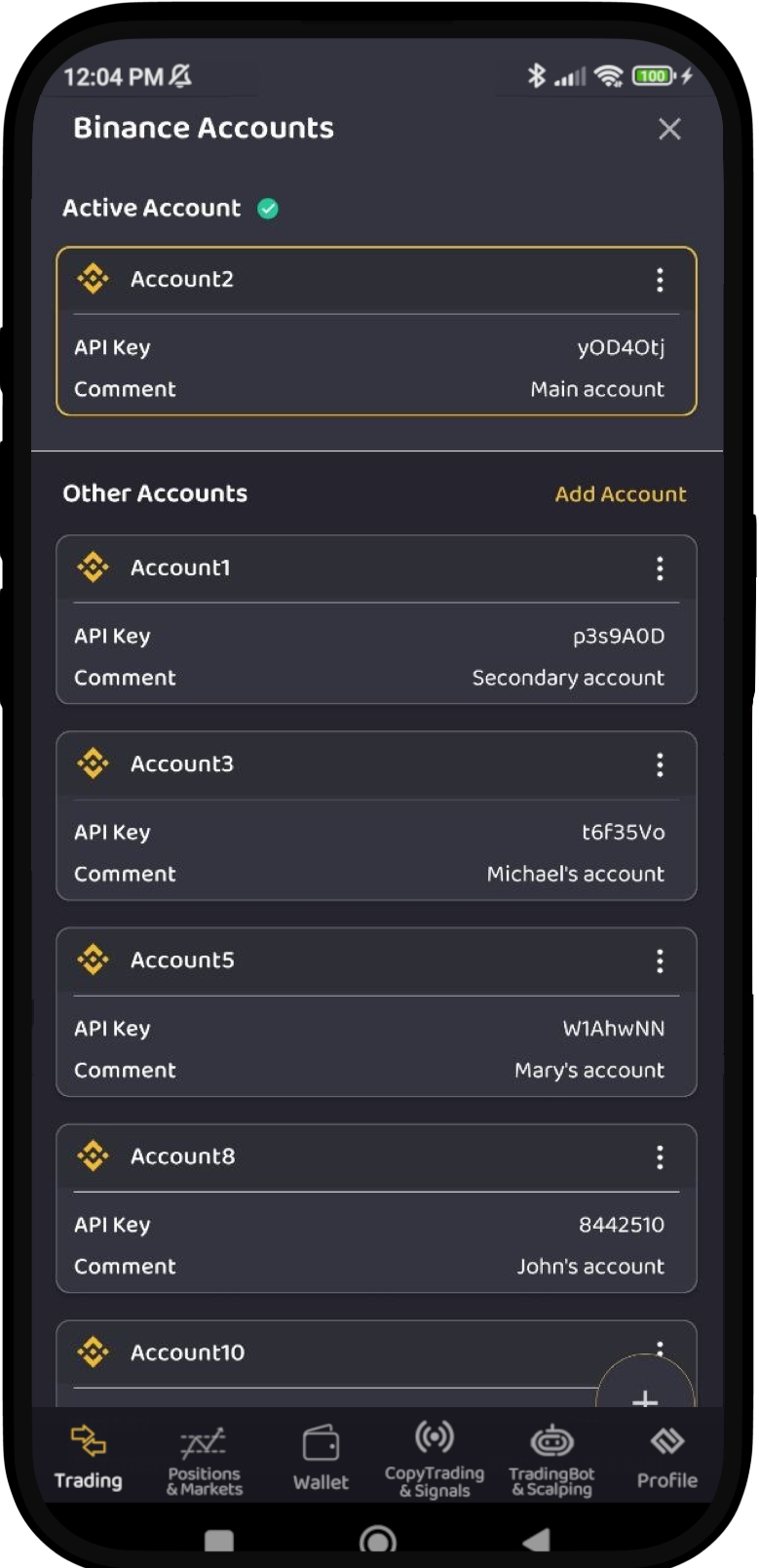 ProfitTradingApp lets you create as many exchange accounts as you need. It's perfect for managing accounts for family, friends, or for brokers who handle multiple accounts.