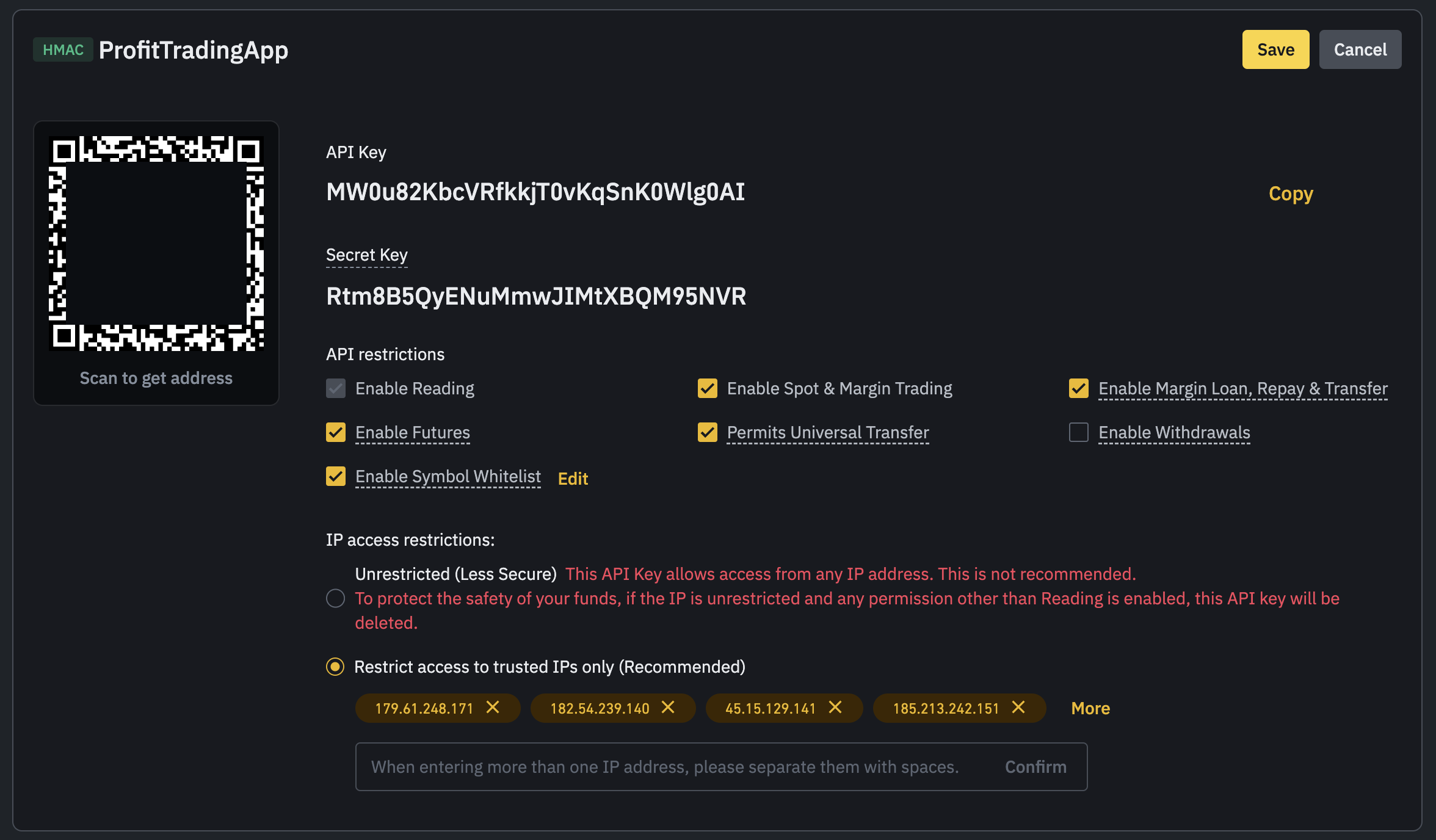 7. Your API key is now created. Copy your API Key and Secret Key and paste them in ProfitTradingApp when requested.
