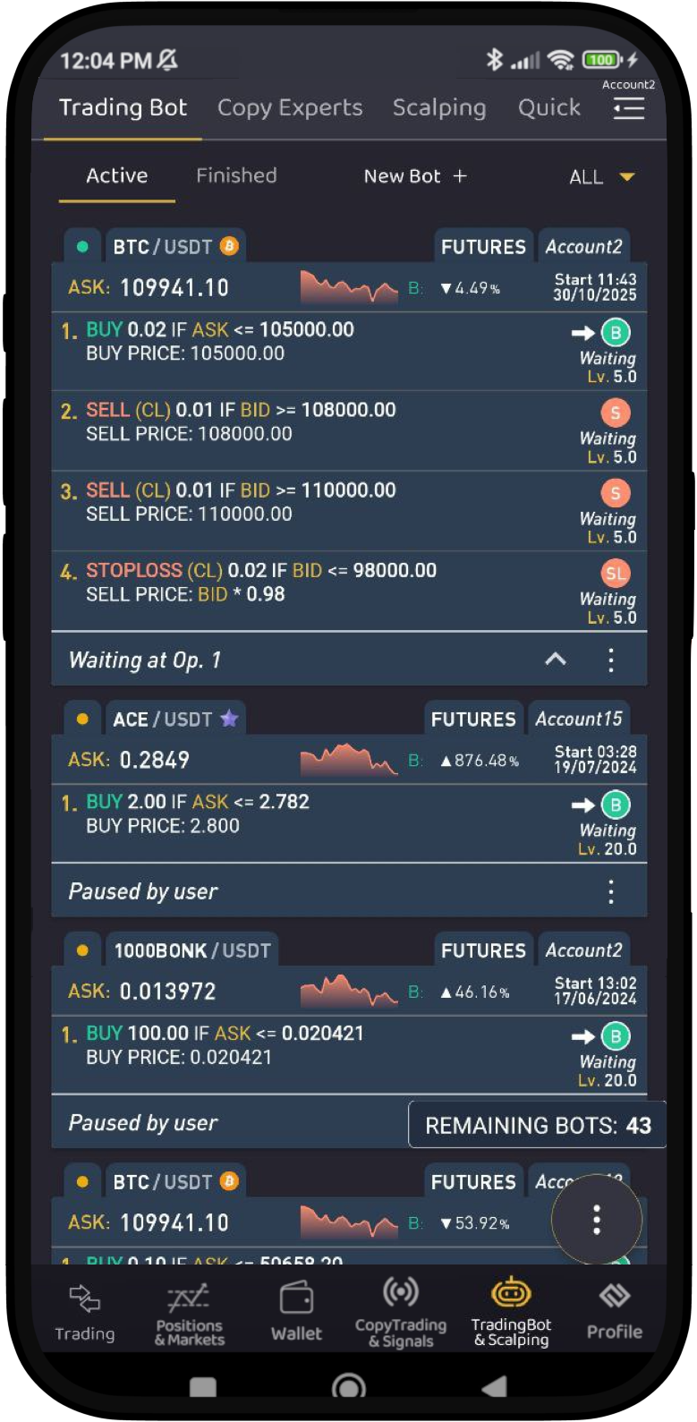 - AutoRestart Bot: Let the bot auto restart when it finishes all its operations. Just configure it once and wait to get your profits.