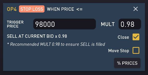 It's recommended to place a SELL PRICE a little lower than TRIGGER PRICE to ensure SELL order is filled. You can also choose the trigger symbol between <= or >=.