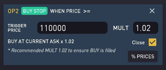 It's recommended to place a BUY PRICE a little higher than TRIGGER PRICE to ensure BUY order is filled. You can also choose the trigger symbol between <= or >= .