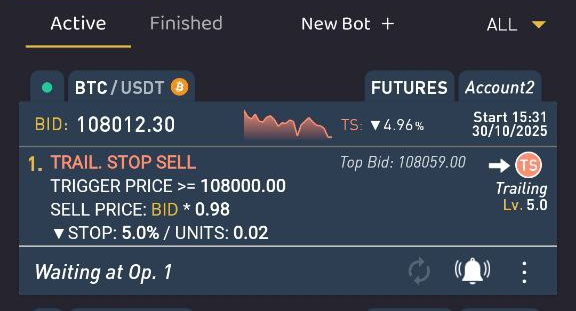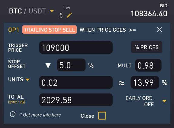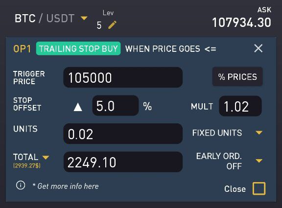 - TRIGGER PRICE: Defines the trigger price when the order will start trailing. From here buy order will decrease it\'s price if coin price gets low.